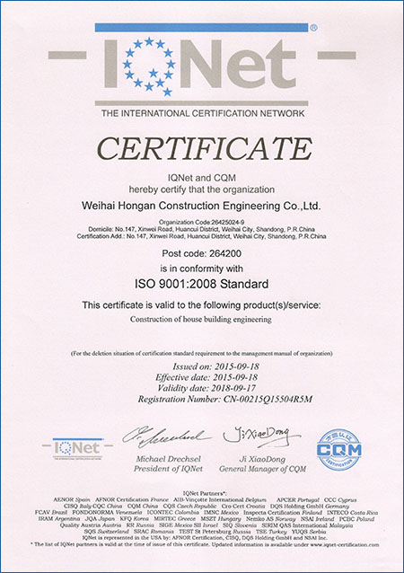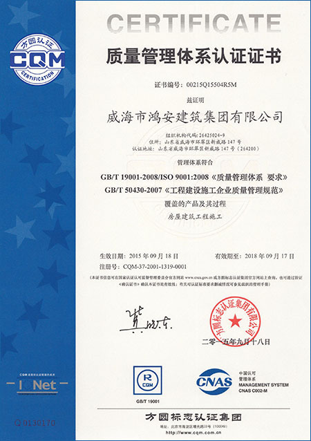 質(zhì)量認(rèn)證證書: